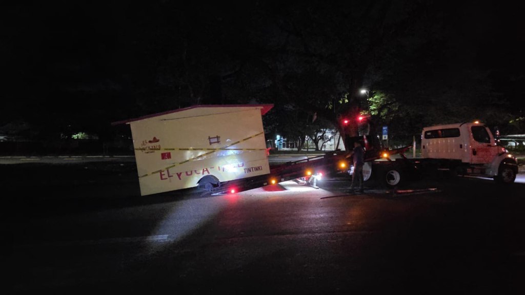 El segundo operativo se realizó en la Avenida Aviación por 18 y 20, en la colonia Libertad. En ese punto fue retirado un remolque tipo “food truck” que se había instalado de forma permanente en la zona, a pesar de no contar con los permisos correspondientes. La estructura bloqueaba el paso vehicular y provocaba la acumulación de basura, generando denuncias ciudadanas realizadas a través de Ayuntatel, tanto al número telefónico 99 99 24 40 00 como al 070.