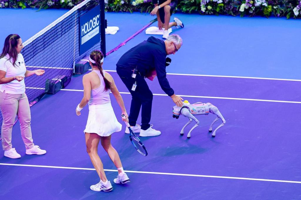 Controlado con un control remoto, el perrito robot se dirige hacia el juez de silla y las jugadoras, el primero toma la moneda y la echa al aire. Y aunque esa no es la principal tarea, o para lo que fue creado Dogo, ha causado una grata impresión durante su presencia en las canchas del complejo tenístico o cuando está paseando.