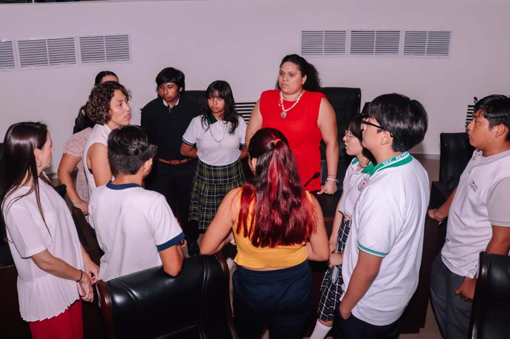 Acompañados por las diputadas Zazhil Méndez Hernández, Itzel Falla Uribe y María Teresa Boehm Calero, así como la subdirectora del DIF Mérida, Seraphine Weber, las y los jóvenes recorrieron las instalaciones, visitando la sala de comisiones “Consuelo Zavala Castillo”, la biblioteca “Profa. Fidelia Sánchez Mendiburu” y el Salón del Pleno.