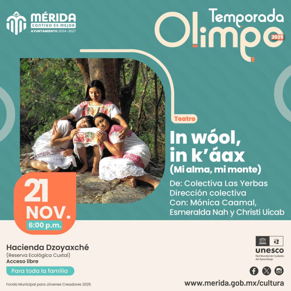 Mérida, Yucatán a 14 de noviembre de 2025.- Llega a la Temporada Olimpo2025 “In wóol, in k’áax” (Mi alma, mi monte), una obra de teatro documental de estreno que invita a mirar las crisis del territorio maya peninsular a partir de la resistencia del trabajo agroecológico, la organización comunitaria, de la sabiduría y la sensibilidad tradicional.